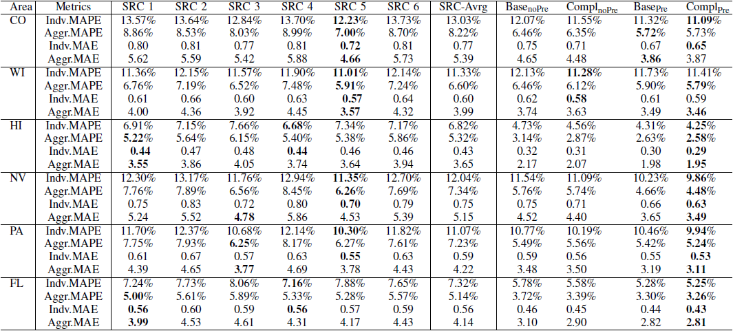 - The attentive transfer model (Compl_Pre) consistently outperforms the conventional baselines and other models in all target areas and all metrics, with an average improvement of 9.79%, 14.37%, 9.99%, and 13.42% in the metrics of Indv.MAPE, Aggr.MAPE, Indv.MAE, and Aggr.MAE, respectively.