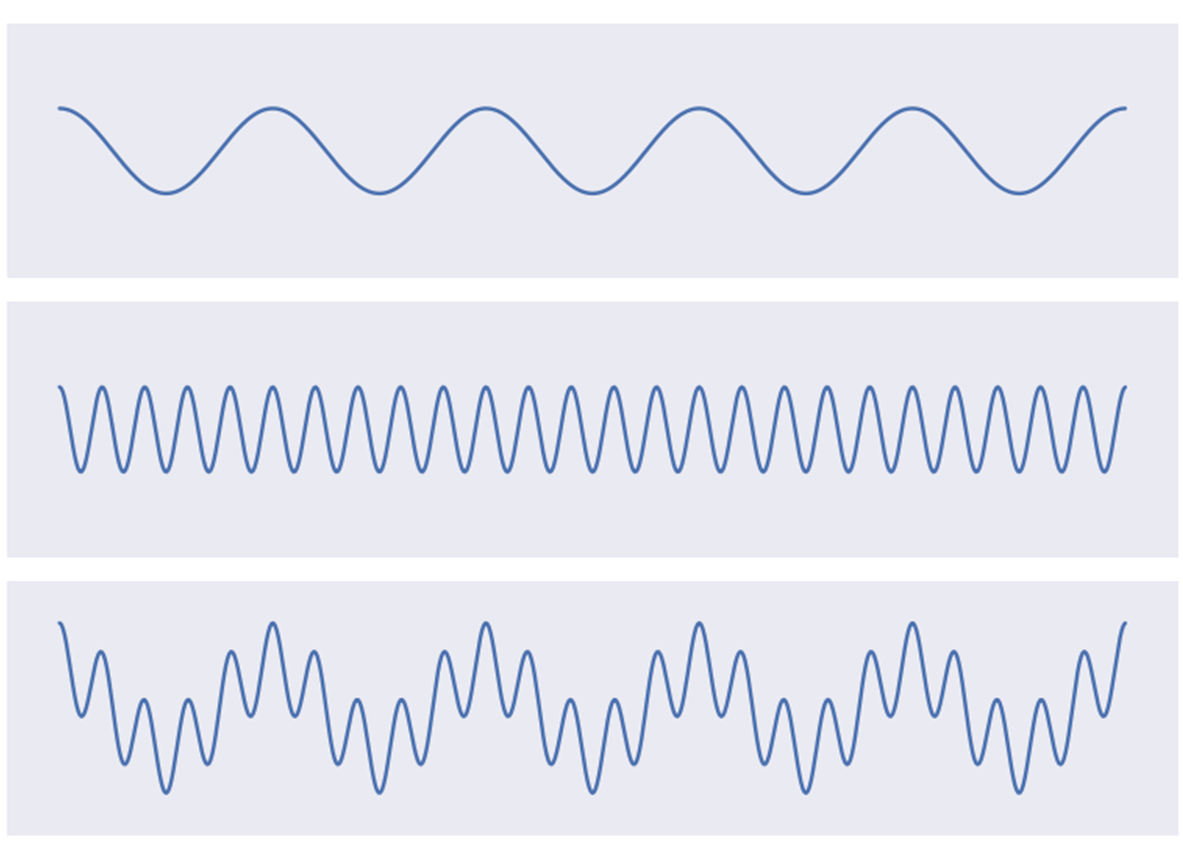 - The frequency components with higher amplitude represent the dominant cycles in the data, while the components with lower amplitude represent less important cycles.