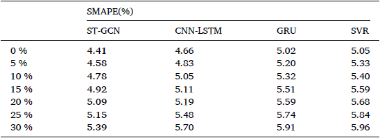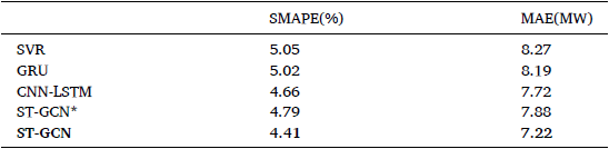 - ST-GCN method is compared with CNN-LSTM, GRU, SVR, and ST-GCN* to carry out comparison experiments.