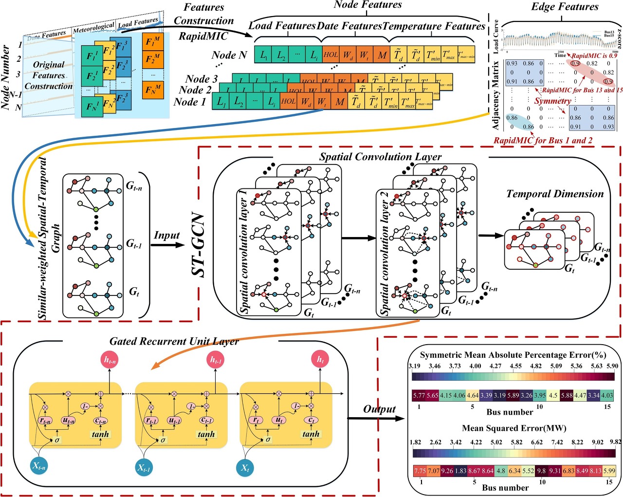 - A short-term load forecasting method for wide-area multiple buses based on ST-GCN is constructed, expanding the node feature types in the similar-weighted spatial-temporal graph to improve the accuracy of the worst evaluation metrics.
