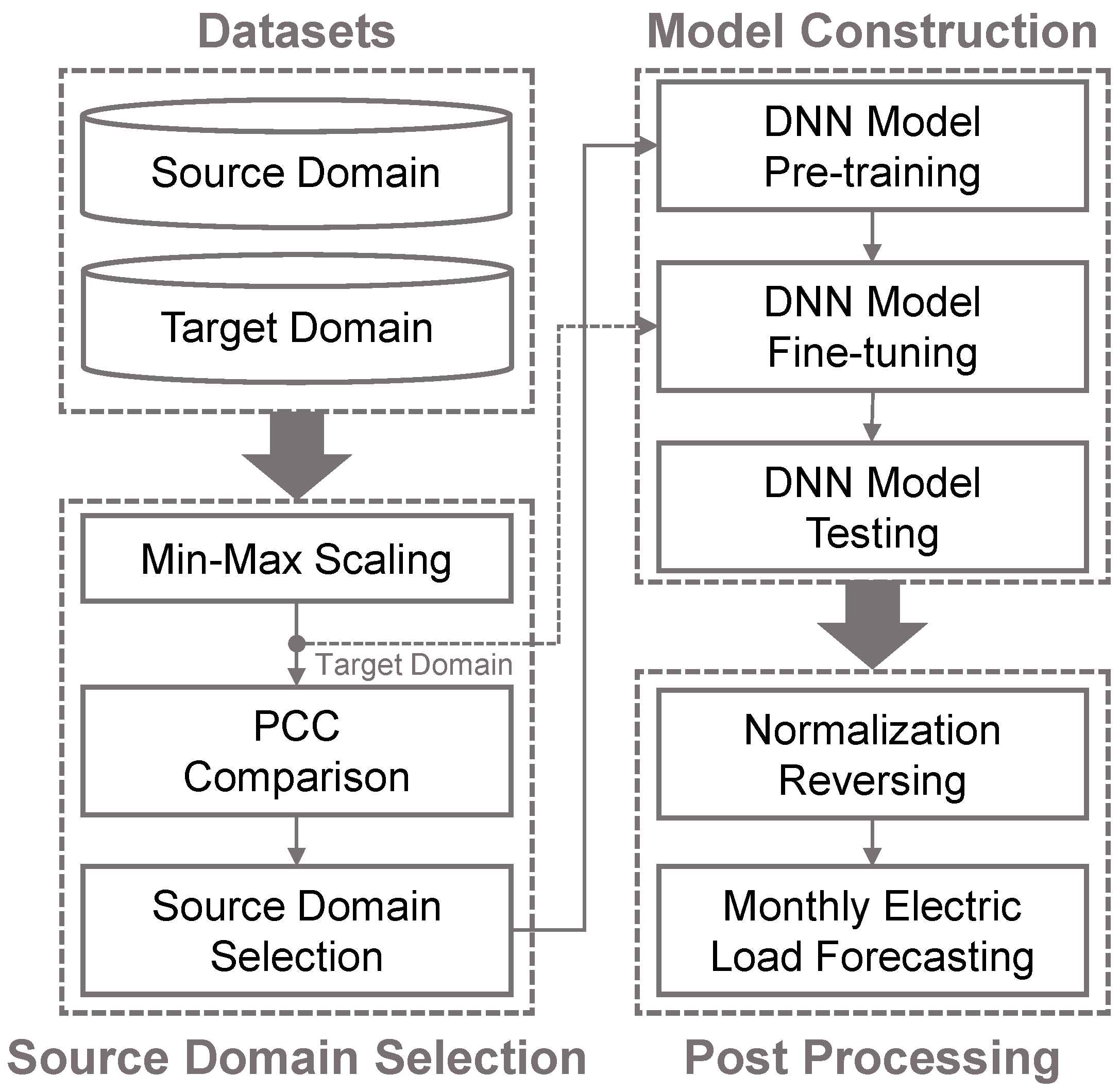 Using the selected source data, a DNN-based forecasting model is constructed, and then fine-tuned using the training set of the target data.