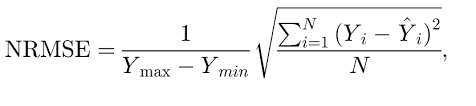- The formula for NRMSE is: NRMSE = RMSE / (y_max - y_min), where RMSE is the root mean squared error, and y_max and y_min are the maximum and minimum values of the dependent variable, respectively.