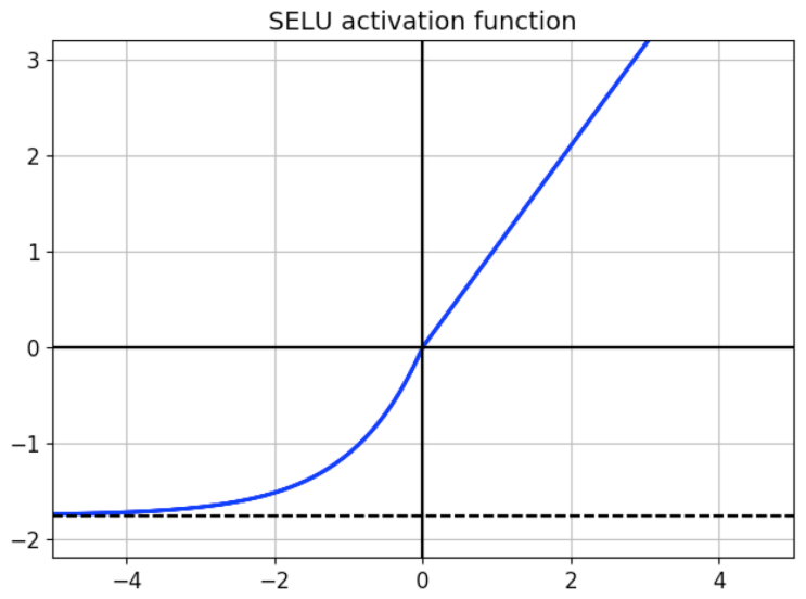 - SELU(x) = scale * (alpha * (exp(x) - 1) for x < 0, x for x >= 0)